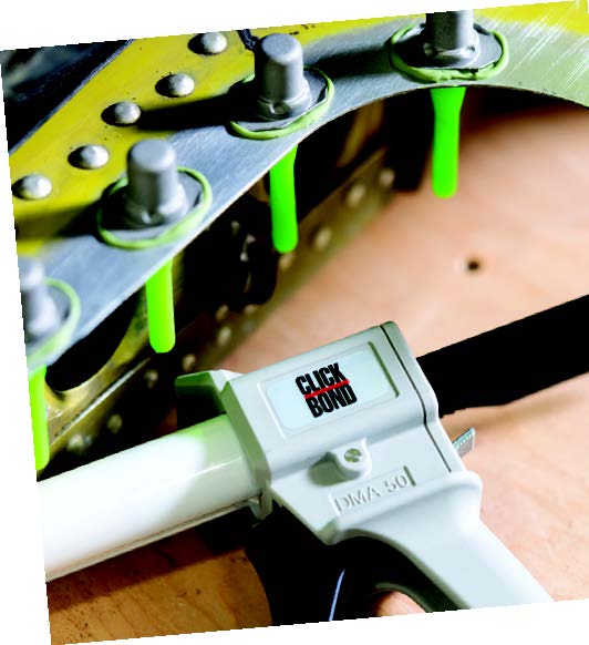 That invention, the Click Patch, launched the Click Bond product line and stimulated further development, leading to dozens of global patents and a diverse line of more than 5,000 adhesive-bonded assembly solutions, available worldwide. Today, Click Bond is headquartered in Carson City, with an additional facility in Watertown, Connecticut, and now employs more than 500 Click Bonders. In its nearly 40-year history, Click Bond, which is still owned by the Hutter family, has earned a reputation as a premier assembly-solutions provider. In addition to the Click Patch, its product line now includes structural hardware, systems installation fasteners, adhesives, and tools, as well as XR-enabled digital solutions that streamline the assembly process. All fasteners are installed using Click Bond’s signature adhesive bonding, which not only eliminates the need for rivets — and the additional drilling of holes in a structure to accommodate them — but also eliminates their associated weight and potential corrosion.